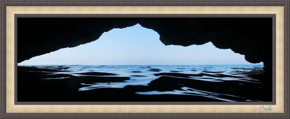 Experience the mystery viewing from inside a sea cave, water stretching into horizon light.